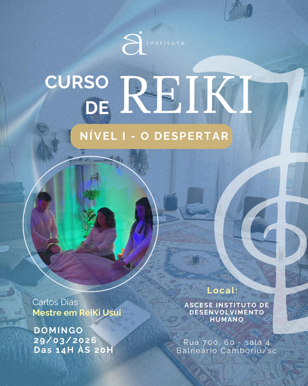Carlos Dias é Mestre em Reiki Usui e, como Terapeuta, dedica sua vida a ajudar pessoas a despertarem seu potencial. Com uma didática acolhedora e profunda, ele guia seus alunos a se conectarem com a energia universal de forma segura e amorosa. Sua missão é tornar o Reiki acessível a todos que buscam não apenas uma terapia, mas um caminho de crescimento e autoconhecimento.
